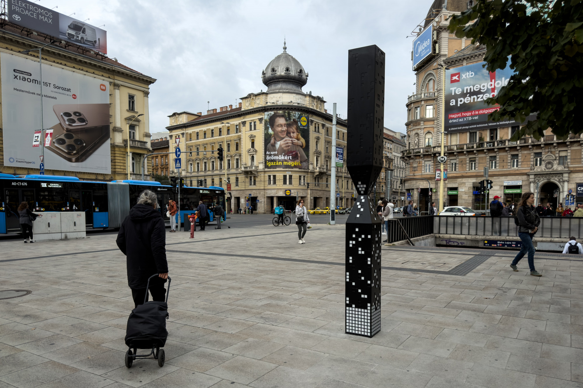 A találkozási pontot keresem a Blaha Lujza téren, és beletelik pár percbe, mire megtalálom. Két nappal csúsztam le az átadását, de most alaposan megtekintem. A fáknál nem magasabb oszlop a maga feketére festett acéljával kiválik a térből, de méretéből adódóan még így is zavartalanul megy el mellette az ember. A legkönnyebben talán az aluljáróból felfele jövet lehet észrevenni, hiszen ott van rögtön előtte.