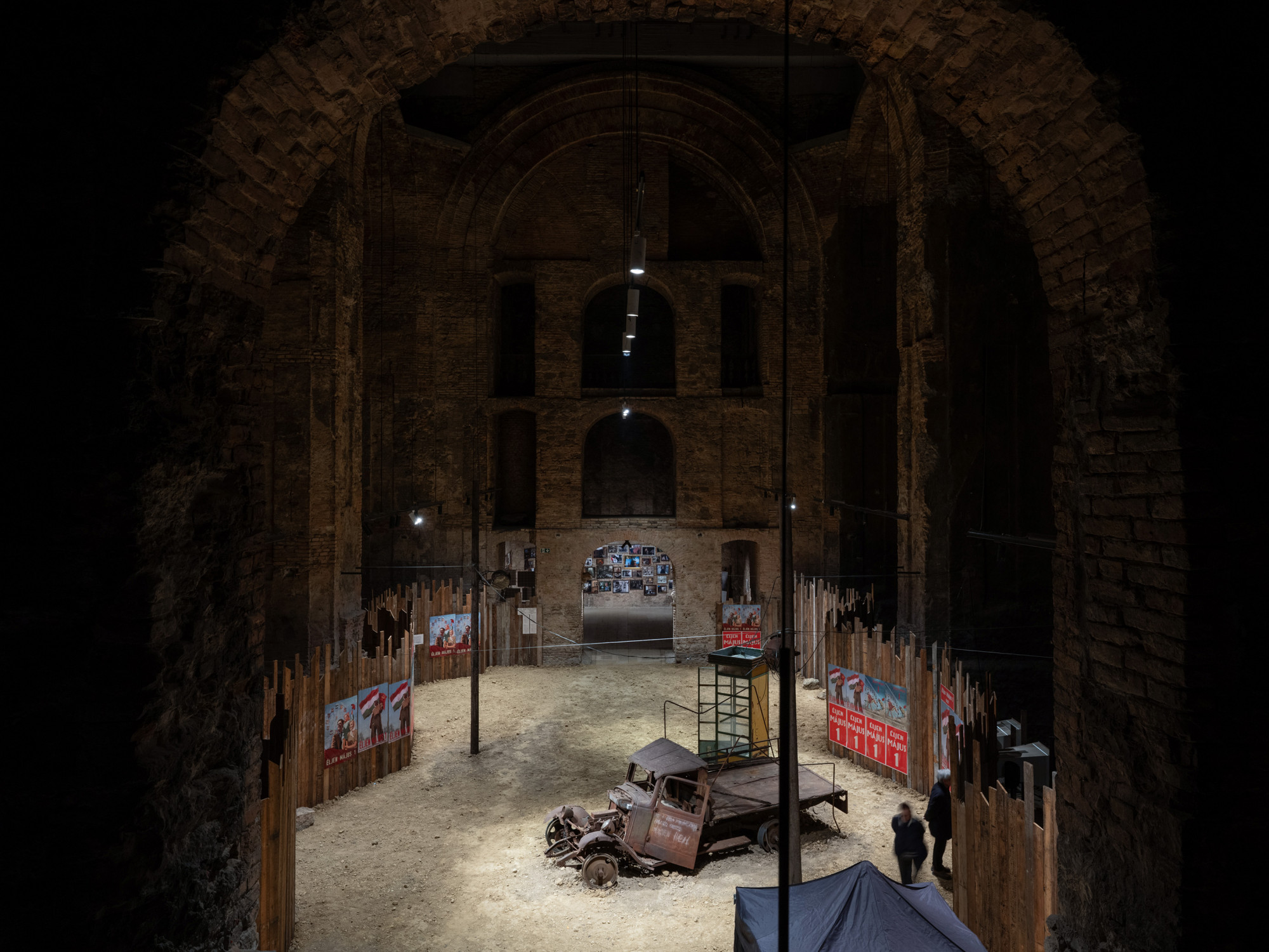 A Kiscelli Múzeum templomterme bármiféle változtatás nélkül is az egyik legjobb hangulatú kiállítótér Budapesten, most pedig a kiállítás kedvéért nagyot alakítottak rajta: a film egyik helyszínét is felidézve a padlóra föld került, középre egy kilőtt teherautó és egy működő régi telefonfülke, a falakra a rendkívül feszült 1957. május elsejei állami rendezvényre hívó plakátok. A termet ráadásul alig és alulról világítják meg, sőt, időnként még éjszakai módba is kapcsol a tárlat, ilyenkor a kevés fényből még kevesebb lesz, pár utcalámpa fénye világít csak.