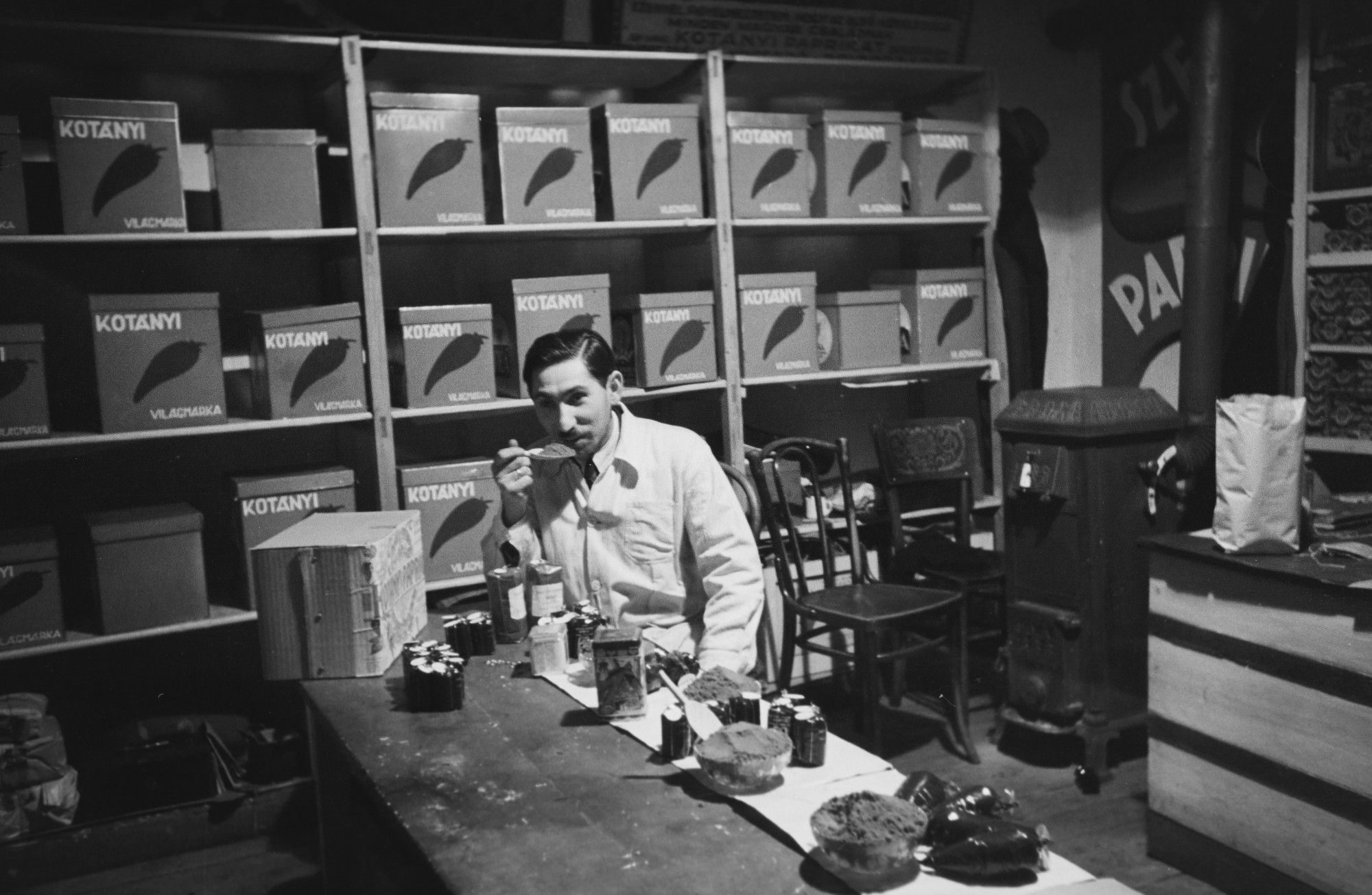 Kotányi János jó ötven évvel azelőtt alapította meg világhírű fűszercégét, mely túlzás nélkül írhatta rá a világmárka megjelölést a pirospaprika őrleményére. Hogy ez egy üzlet-e, vagy valami más helyisége a vállalatnak, az ebből a képből nem derül ki, de pont ez az elkapott pillanat, aminek az összes kis részletén jó elidőzni.