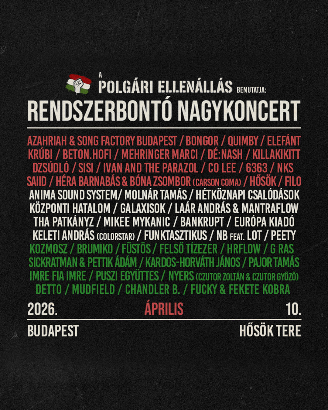 Most pénteken hangerőt adunk az elaljasult hatalommal szemben, hogy megmutassuk: véget ért a következménytelenség kora. Szavazz vasárnap és bontsuk el a hűbéri államrendet! 2026 április 10., 16:00, Hősök tere. Légy jelen, vagy kövesd a koncertet a Szélsőközép YouTube csatornáján!